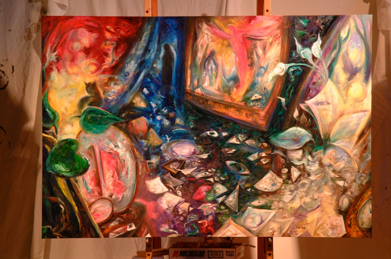 “The symbolism within the painting is a dialogue that emerges with each stroke of the brush. As I paint, layers are unveiled. Each discovery leads to another and another. Some things that end up on the canvas are conscious and others are a result of simply allowing myself to paint and to let the dialogue emerge. It is a dance that sometimes feels very fragile, and other times is so rich as to be joyous.”